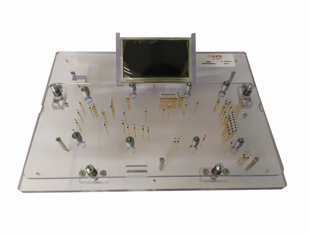 Nadeladapter zur Funktionsprüfung von kundenspezifischen Leiterplatten und Baugruppen. Individuelle Aufnahme und Zentrierung der Prüflinge. Kontaktstifteschutz durch zweite Ebene.