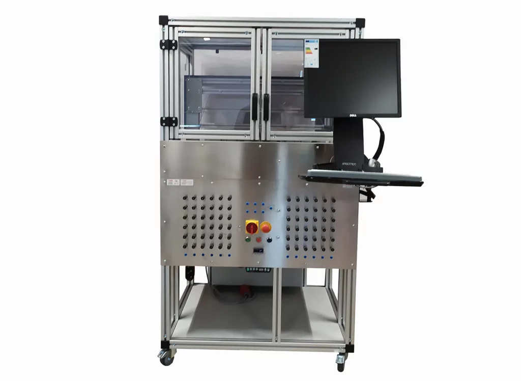 Prüfvorrichtung zum Testen von Schaltern und Tastern. Thermische Erwärmung der Prüfkabine durch Heizplatte. Thermisch und elektrisch isolierende Schutzumhausung aus Polycarbonat. Variabler Innenaufbau zur Prüflingsaufnahme. Betätigung der Prüflinge durch Linearmotoren. Frontpanel mit Anschlussmöglichkeiten für Messleitungen und potentialfreie Kontakte zum Schalten von Lasten.