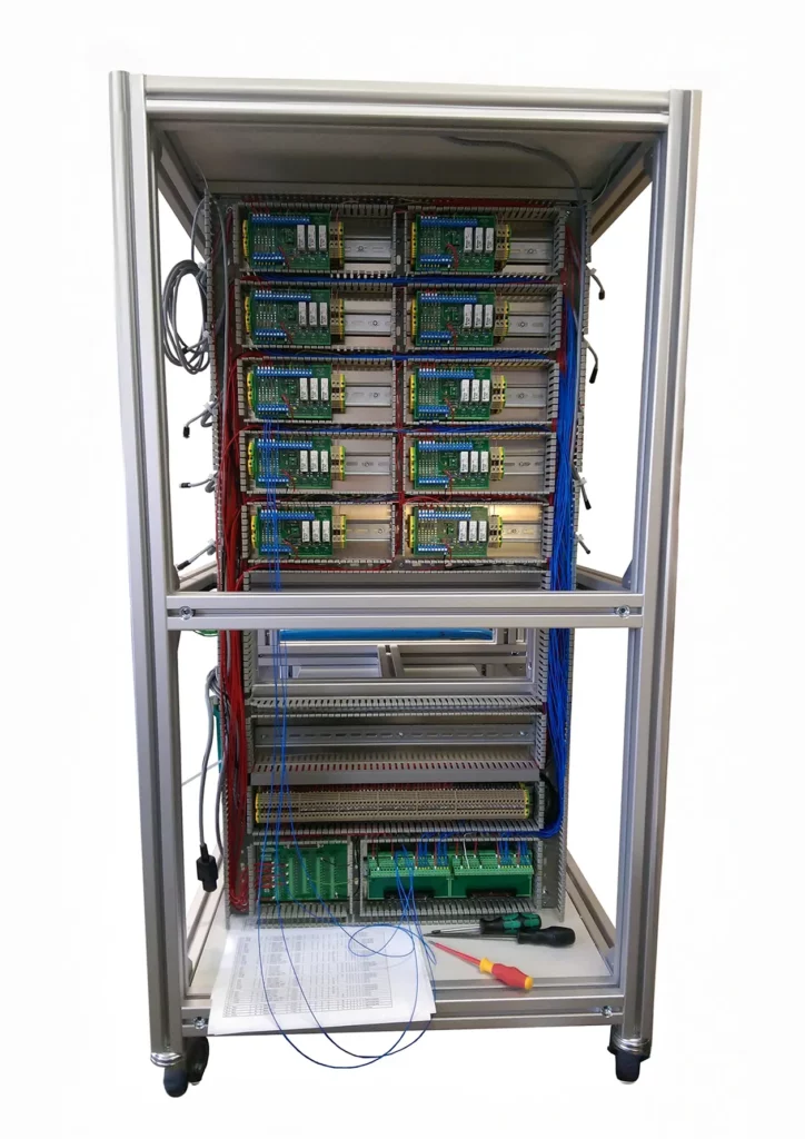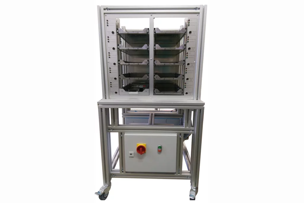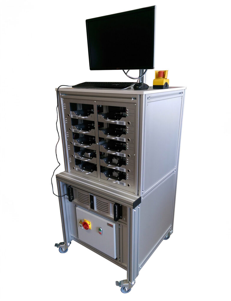 System zum Vorwärmen von Sensoren vor deren Linearisierung und Kalibrierung durch Anlegen der Versorgungsspannung und Eigenerwärmung. Zehn Schubladen zur Aufnahme von gesamt zehn Prüflingen. Erkennung des Prüflingstyps durch Barcodeleser und Datenbankanbindung der Benutzersoftware. Automatische Einstellung der jeweiligen Versorgungsspannung mit Kurzschlussüberwachung. Verwaltung der Vorwärmzeiten durch den Computer. Signalisierung des Zustands des Prüflings am Bildschirm und durch LED-Anzeige je Schublade. Überwachung der Stromaufnahme und Protokollierung der Messwerte in der Datenbank. Verknüpfung mit anschließendem Prüfplatz zur Linearisierung und Kalibrierung.
